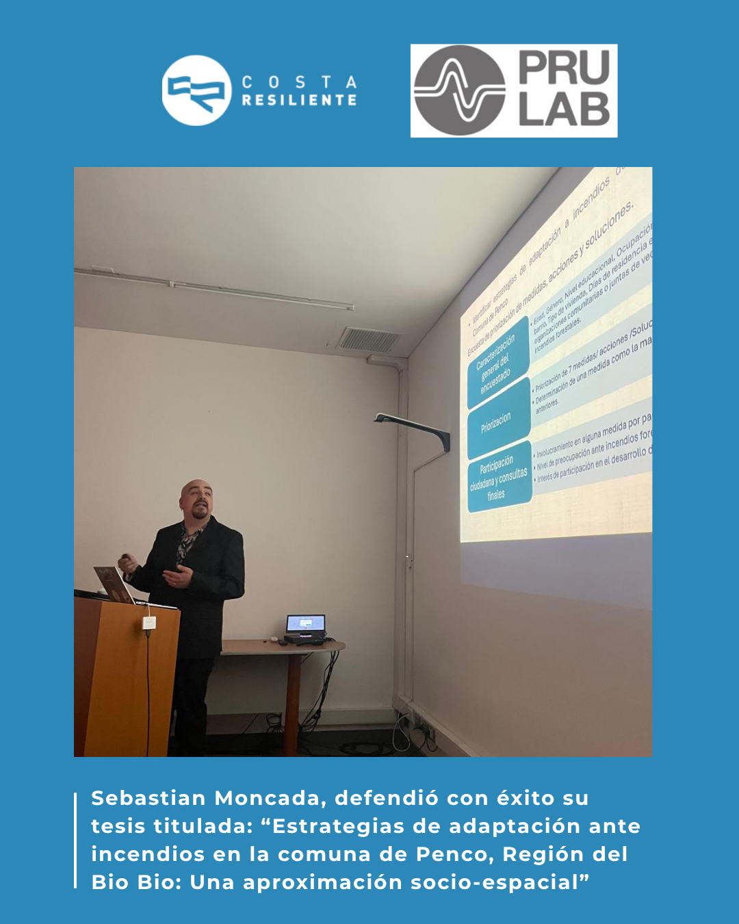 El pasado lunes 6 de octubre, Sebastián Moncada, defendió con éxito su tesis titulada: “Estrategias de adaptación ante incendios de interfaz en la comuna de Penco, Región del Bio-Bio: Una aproximación socio-espacial.”