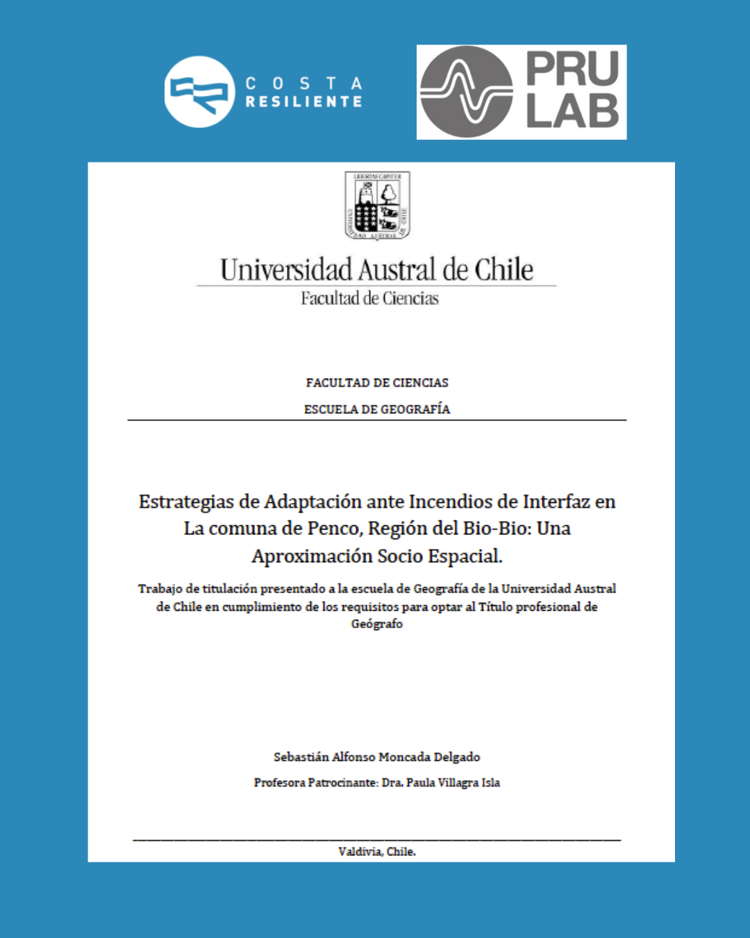 La tesis de Sebastián fue guiada por Paula Villagra Islas (ICAEV, PRULAB, UACh), y se realizó en el marco del proyecto ANID/PINC 230017 “Portafolio de soluciones para fortalecer la resiliencia frente a incendios forestales: Una aproximación comunitaria y sistémica para la planificación y gestión del territorio”. Concurso Desafíos para la recuperación post-incendios.