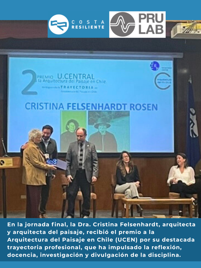 ▪︎ En la jornada final, la Dra. Cristina Felsenhardt, arquitecta y arquitecta del paisaje, recibió el premio a la Arquitectura del Paisaje en Chile (UCEN) por su destacada trayectoria profesional, que ha impulsado la reflexión, docencia, investigación y divulgación de la disciplina.